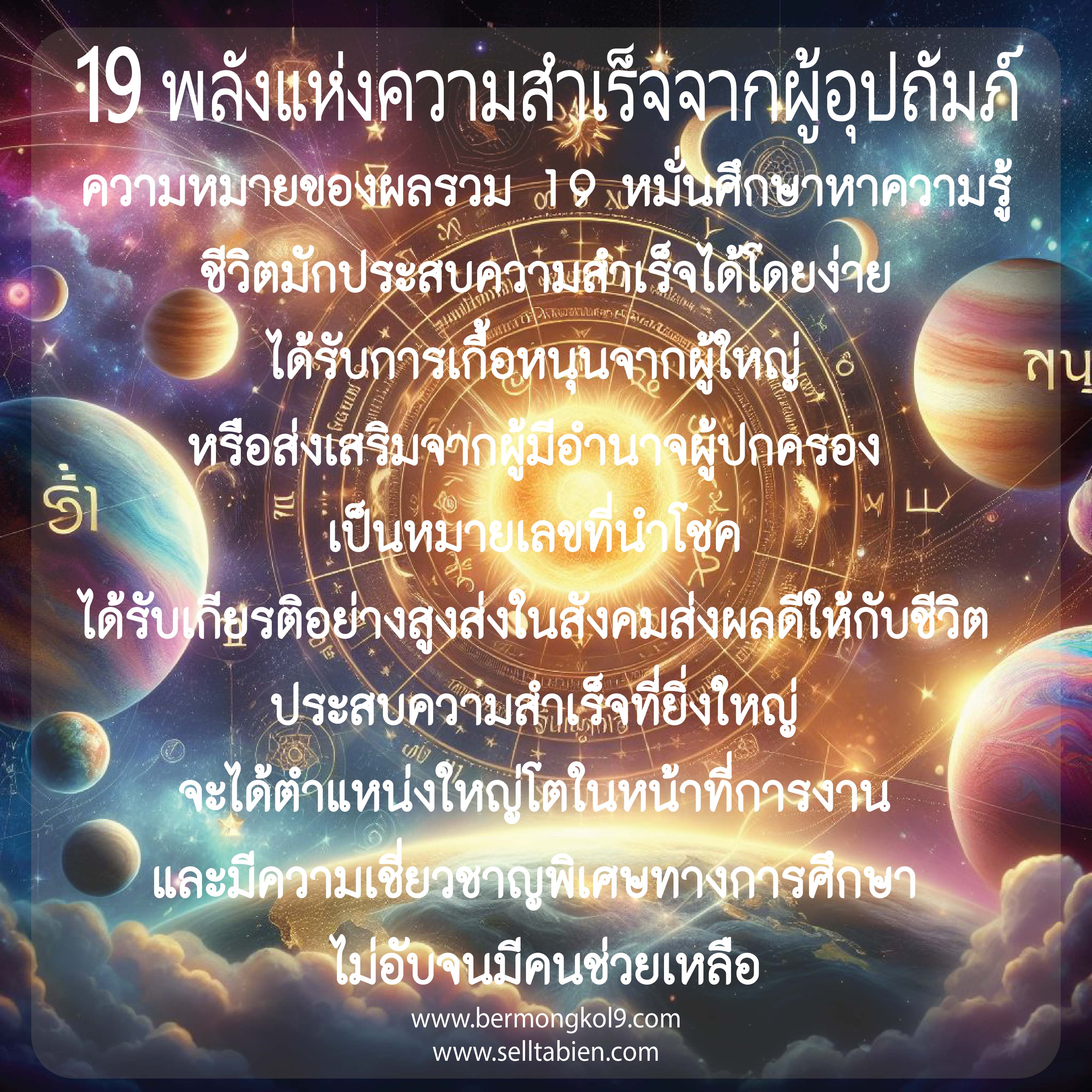 ความหมายของผลรวม 19 หมั่นศึกษาหาความรู้ ชีวิตมักประสบความสำเร็จได้โดยง่าย ได้รับการเกื้อหนุนจากผู้ใหญ่ หรือส่งเสริมจากผู้มีอำนาจผู้ปกครอง เป็นหมายเลขที่นำโชค ได้รับเกียรติอย่างสูงส่งในสังคมส่งผลดีให้กับชีวิต ประสบความสำเร็จที่ยิ่งใหญ่ จะได้ตำแหน่งใหญ่โตในหน้าที่การงาน และมีความเชี่ยวชาญพิเศษทางการศึกษา ไม่อับจนมีคนช่วยเหลือ