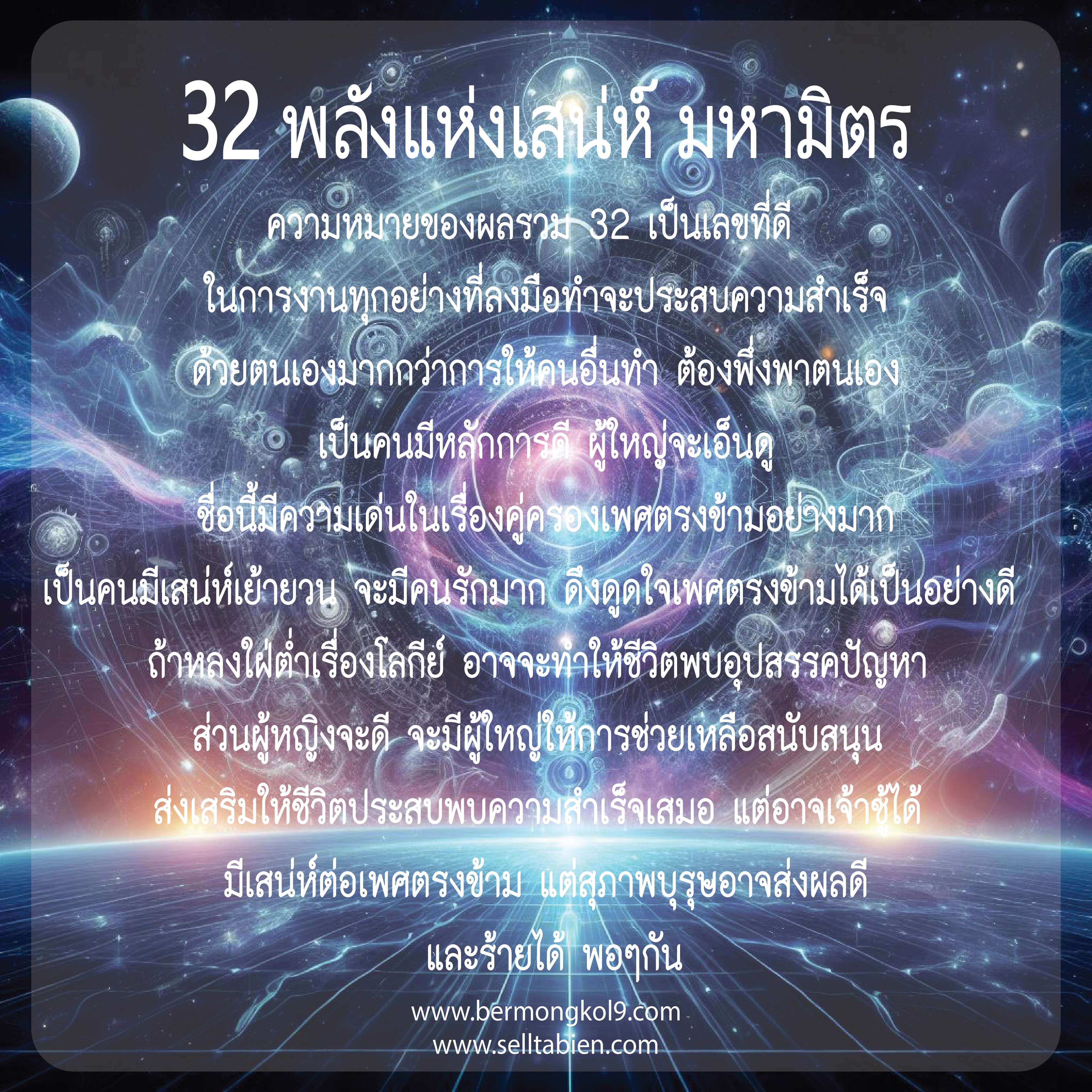 ความหมายของผลรวม 32 เป็นเลขที่ดี ในการงานทุกอย่างที่ลงมือทำจะประสบความสำเร็จด้วยตนเองมากกว่าการให้คนอื่นทำ ต้องพึ่งพาตนเอง เป็นคนมีหลักการดี ผู้ใหญ่จะเอ็นดู ชื่อนี้มีความเด่นในเรื่องคู่ครองเพศตรงข้ามอย่างมาก เป็นคนมีเสน่ห์เย้ายวน จะมีคนรักมาก ดึงดูดใจเพศตรงข้ามได้เป็นอย่างดี ถ้าหลงใฝ่ต่ำเรื่องโลกีย์ อาจจะทำให้ชีวิตพบอุปสรรคปัญหา ส่วนผู้หญิงจะดี จะมีผู้ใหญ่ให้การช่วยเหลือสนับสนุน ส่งเสริมให้ชีวิตประสบพบความสำเร็จเสมอ แต่อาจเจ้าชู้ได้ มีเสน่ห์ต่อเพศตรงข้าม แต่สุภาพบุรุษอาจส่งผลดี และร้ายได้ พอๆกัน