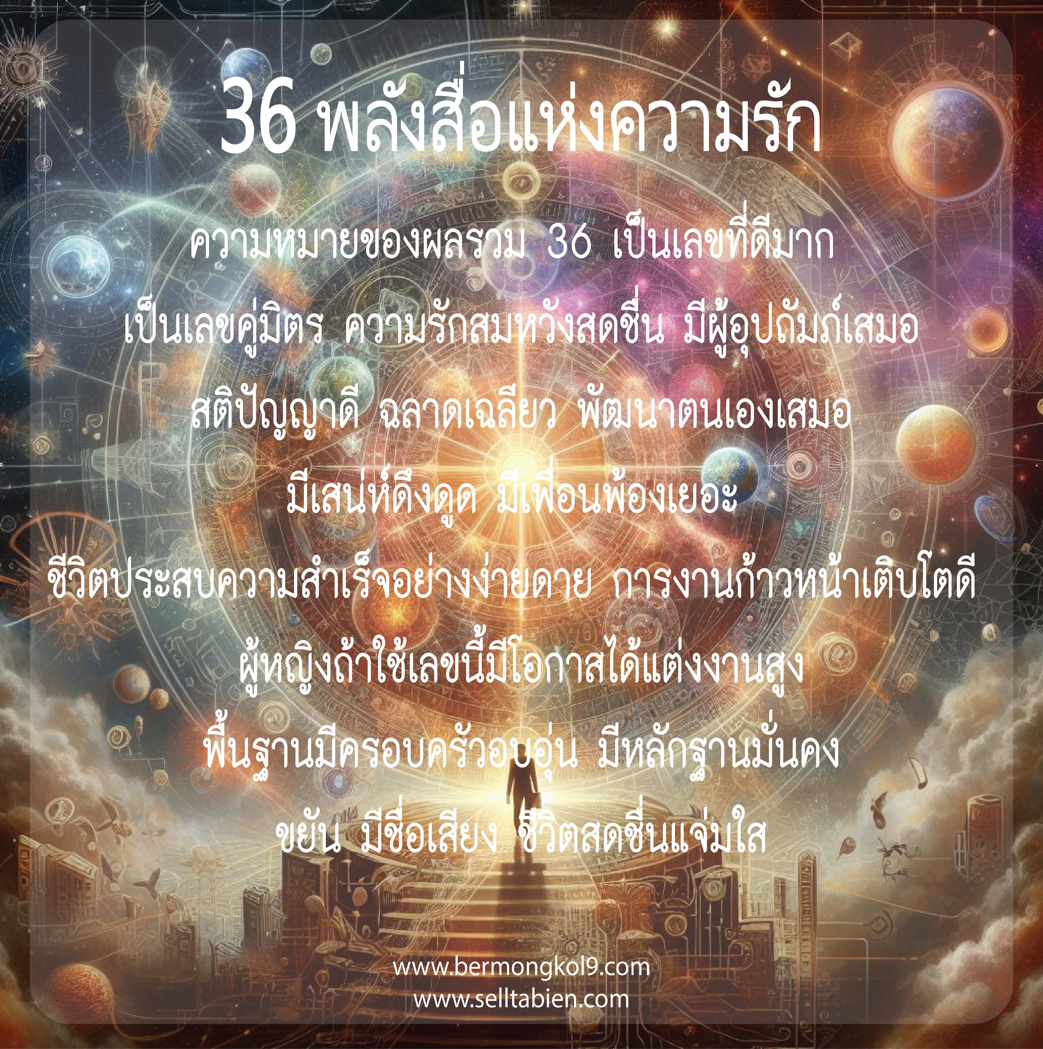 ความหมายของผลรวม 36 เป็นเลขที่ดีมาก เป็นเลขคู่มิตร ความรักสมหวังสดชื่นมีผู้อุปถัมภ์เสมอ สติปัญญาดี ฉลาดเฉลียว พัฒนาตนเองเสมอ มีเสน่ห์ดึงดูด มีเพื่อนพ้องเยอะ ชีวิตประสบความสำเร็จอย่างง่ายดาย การงานก้าวหน้าเติบโตดี ผู้หญิงถ้าใช้เลขนี้มีโอกาสได้แต่งงานสูง พื้นฐานมีครอบครัวอบอุ่น มีหลักฐานมั่นคง ขยัน มีชื่อเสียง ชีวิตสดชื่นแจ่มใส