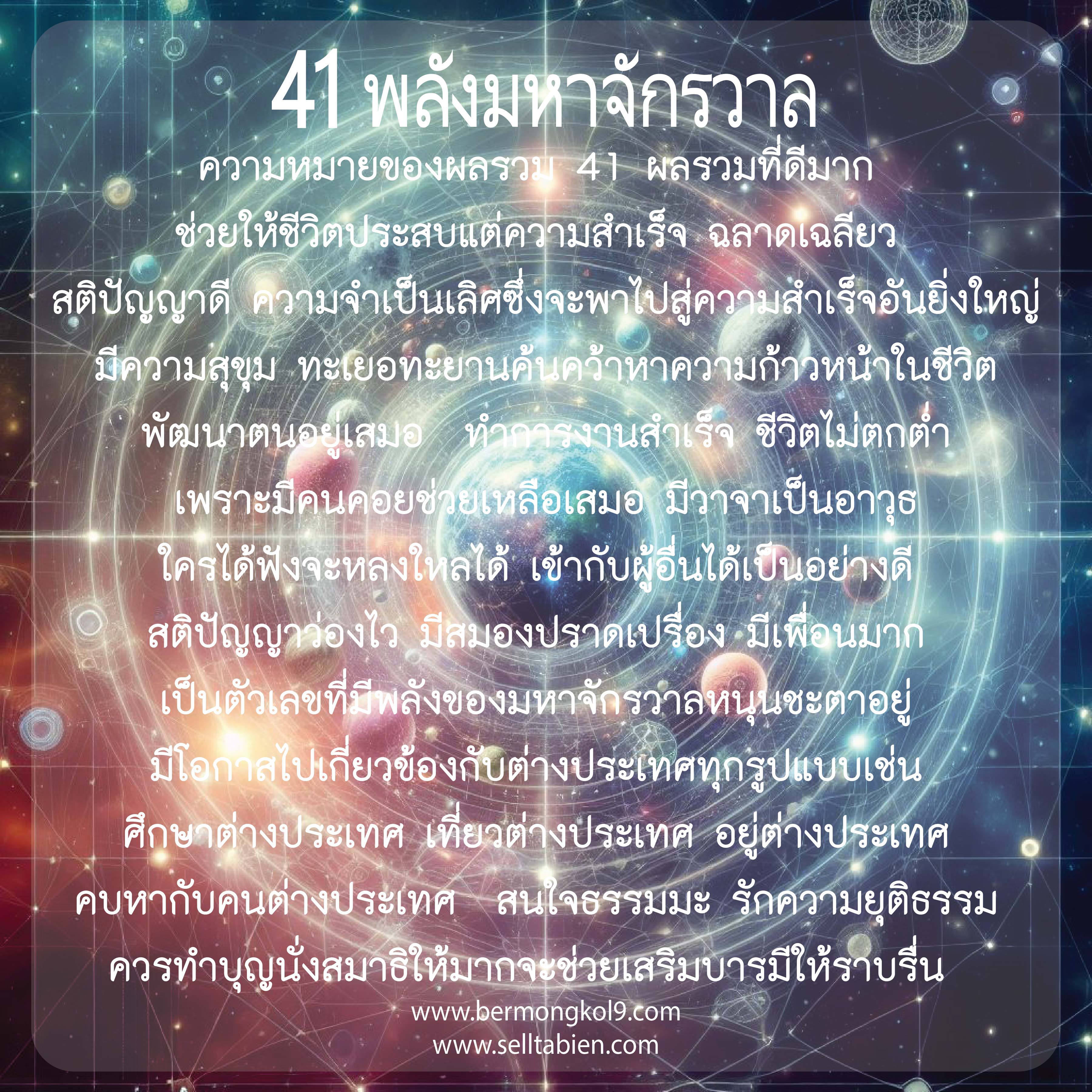 ความหมายของผลรวม 41 ผลรวมที่ดีมาก ช่วยให้ชีวิตประสบแต่ความสำเร็จ ฉลาดเฉลียว สติปัญญาดี ความจำเป็นเลิศซึ่งจะพาไปสู่ความสำเร็จอันยิ่งใหญ่ มีความสุขุม ทะเยอทะยานค้นคว้าหาความก้าวหน้าในชีวิต พัฒนาตนอยู่เสมอ ทำการงานสำเร็จ ชีวิตไม่ตกต่ำ เพรามีคนคอยช่วยเหลือเสมอ มีวาจาเป็นอาวุธ ใครได้ฟังจะหลงใหลได้ เข้ากับผู้อื่นได้เป็นอย่างดี สติปัญญาว่องไว มีสมองปราดเปรื่อง มีเพื่อนมาก เป็นตัวเลขที่มีพลังของมหาจักรวาลหนุนชะตาอยู่ มีโอกาสไปเกี่ยวข้องกับต่างประเทศทุกรูปแบบเช่น ศึกษาต่างประเทศ เที่ยวต่างประเทศ อยู่ต่างประเทศ คบหากับคนต่างประเทศ สนใจธรรมมะ รักความยุติธรรม ควรทำบุญนั่งสมาธิให้มากจะช่วยเสริมบารมีให้ราบรื่น