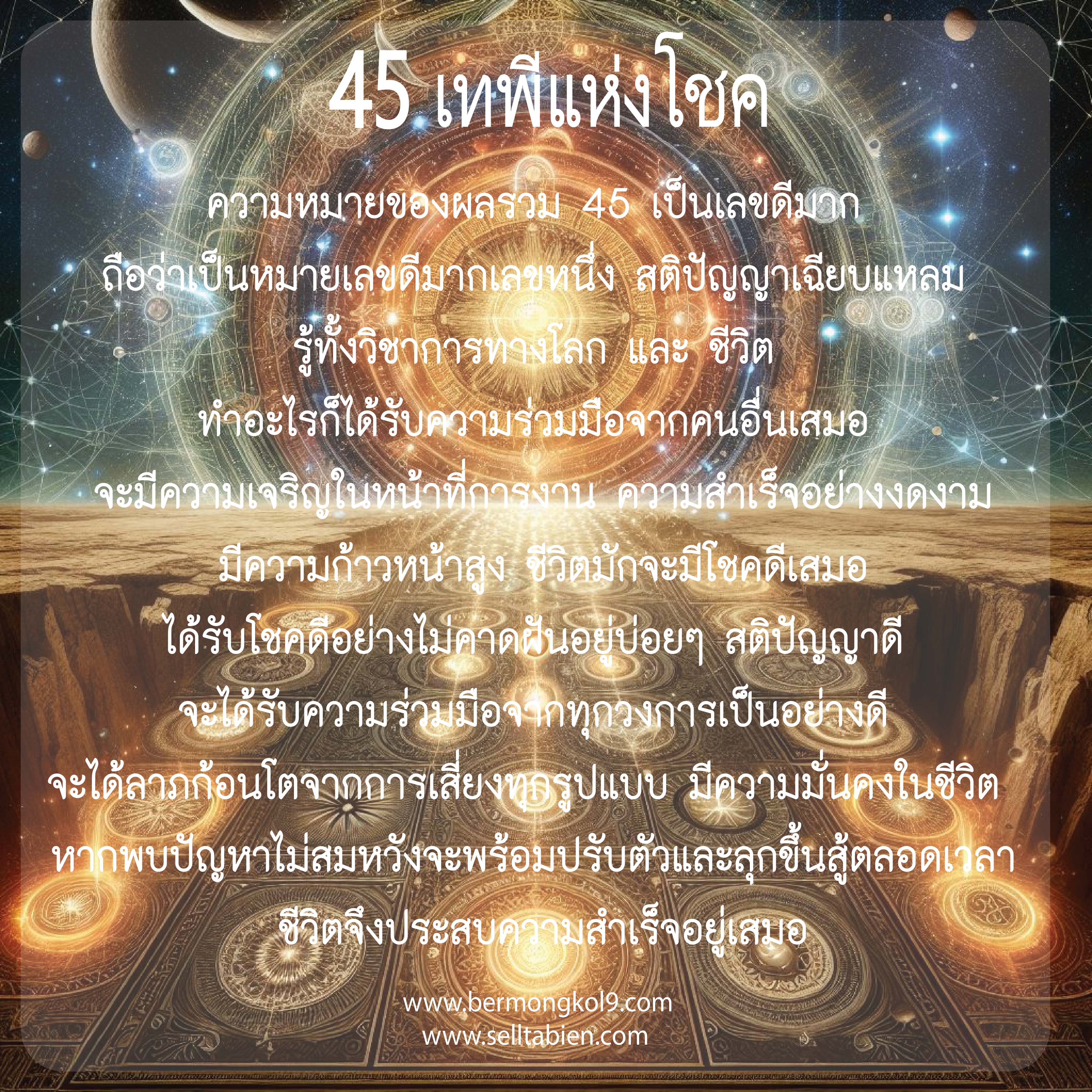 ความหมายของผลรวม 45 เป็นเลขดีมาก ถือว่าเป็นหมายเลขดีมากเลขหนึ่ง สติปัญญาเฉียบแหลม รู้ทั้งวิชาการทางโลก และ ชีวิต ทำอะไรก็ได้รับความร่วมมือจากคนอื่นเสมอ จะมีความเจริญในหน้าที่การงาน ความสำเร็จอย่างงดงาม มีความก้าวหน้าสูง ชีวิตมักจะมีโชคดีเสมอ ได้รับโชคดีอย่างไม่คาดฝันอยู่บ่อยๆ สติปัญญาดี จะได้รับความร่วมมือจากทุกวงการเป็นอย่างดี จะได้ลาภก้อนโตจากการเสี่ยงทุกรูปแบบ มีความมั่นคงในชีวิต หากพบปัญหาไม่สมหวังจะพร้อมปรับตัวและลุกขึ้นสู้ตลอดเวลา ชีวิตจึงประสบความสำเร็จอยู่เสมอ