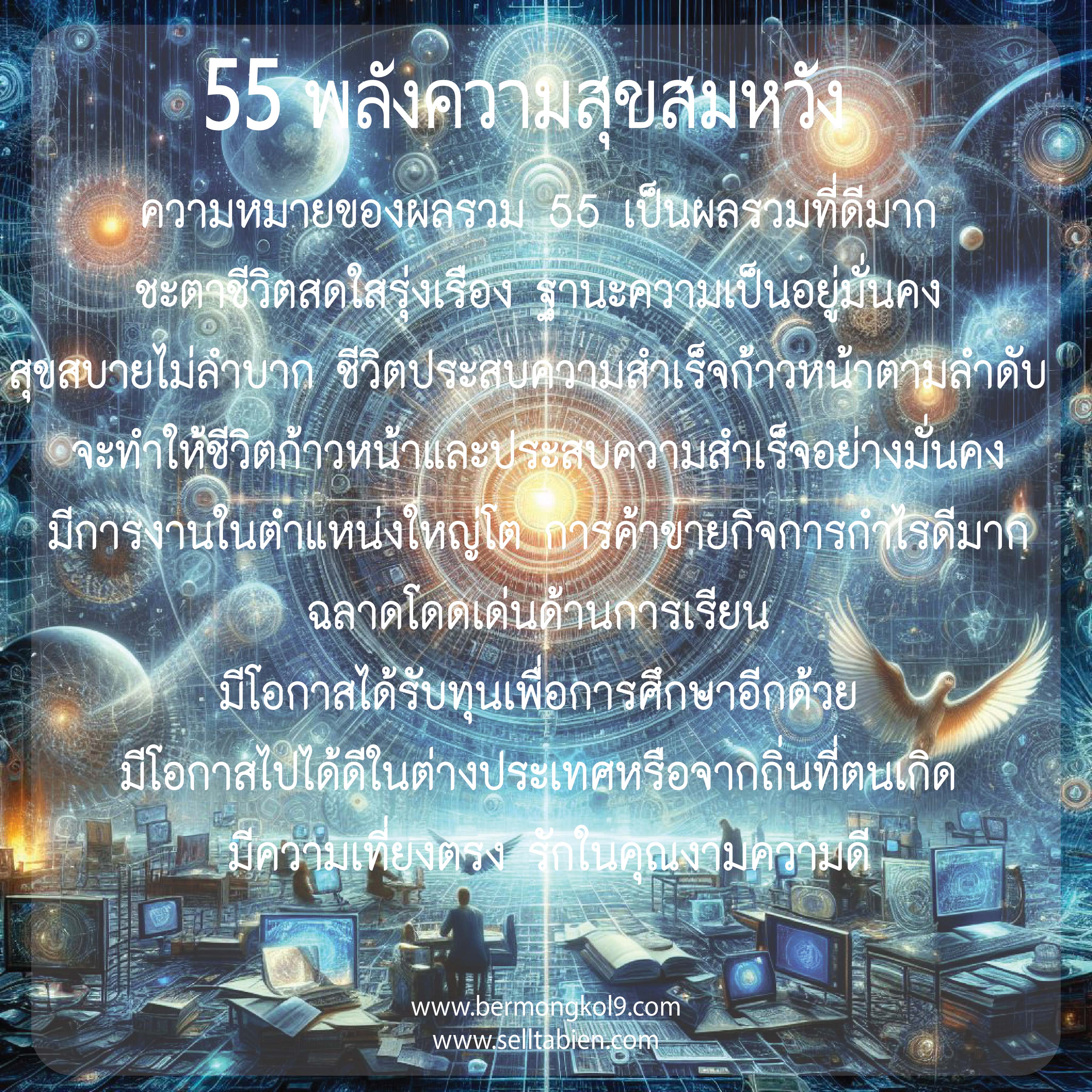 ความหมายของผลรวม 55 เป็นผลรวมที่ดีมาก ชะตาชีวิตสดใสรุ่งเรือง ความเป็นอยู่มั่นคง สุขสบายไม่ลำบาก ชีวิตประสบความสำเร็จก้าวหน้าตามลำดับ จะทำให้ชีวิตก้าวหน้าและประสบความสำเร็จอย่างมั่นคง มีการงานในตำแหน่งใหญ่โต การค้าขายกิจการกำไรดีมาก ฉลาดโดดเด่นด้านการเรียน มีโอกาสได้รับทุนเพื่อการศึกษาอีกด้วย มีโอกาสไปได้ดีในต่างประเทศหรือจากถิ่นที่ตนเกิด มีความเที่ยงตรง รักในคุณงามความดี