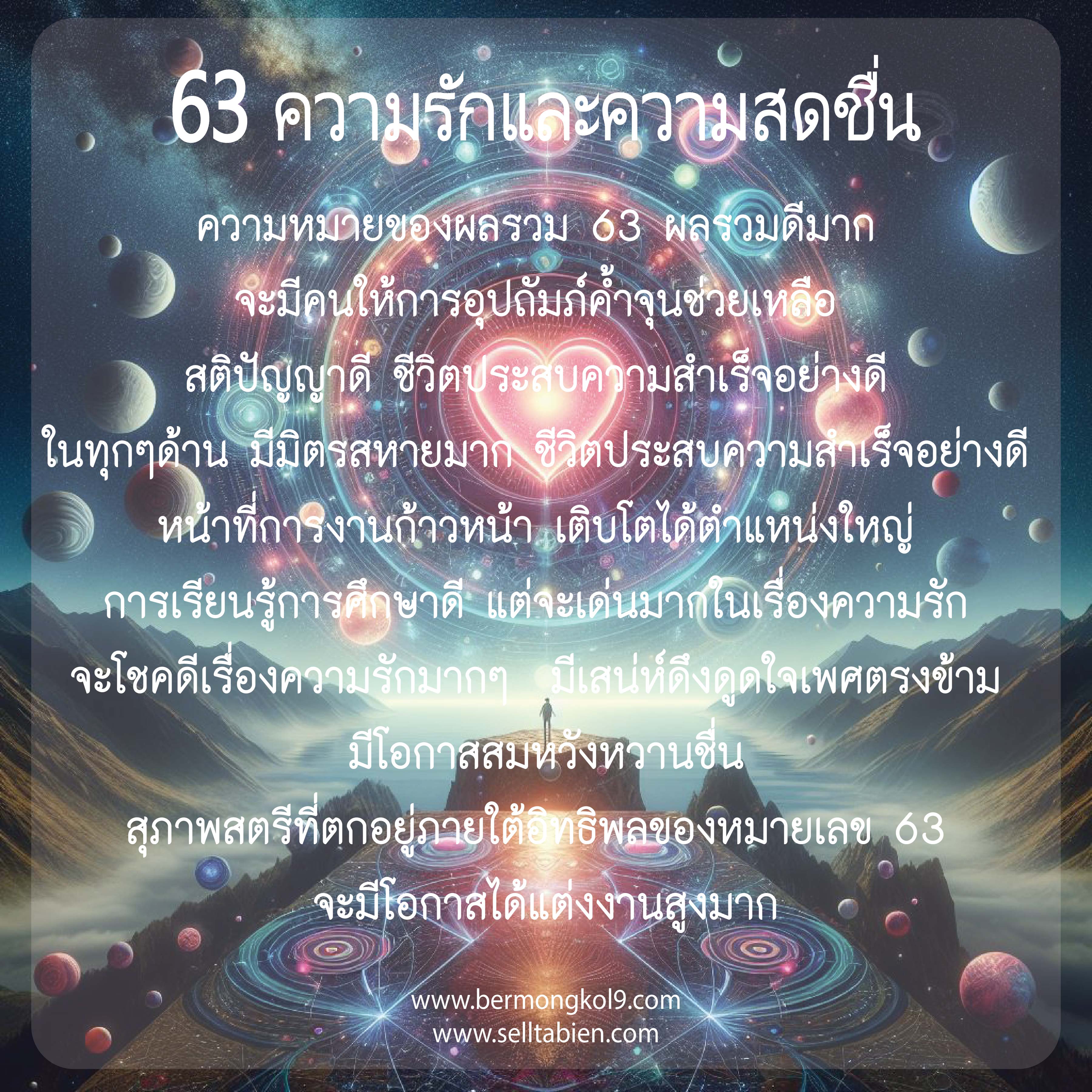 ความหมายของผลรวม 63 ผลรวมดีมาก จะมีคนให้การอุปถัมภ์ค้ำจุนช่วยเหลือ สติปัญญาดี ชีวิตประสบความสำเร็จอย่างดี ในทุกๆด้าน มีมิตรสหายมาก ชีวิตประสบความสำเร็จอย่างดี หน้าที่การงานก้าวหน้า เติบโตได้ตำแหน่งใหญ่ การเรียนรู้การศึกษาดี